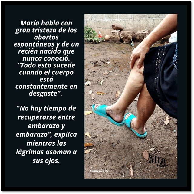 Las historias de pérdida son frecuentes en su hogar. María habla con gran tristeza de los abortos espontáneos y de un recién nacido que nunca conoció. “Todo esto sucede cuando el cuerpo está constantemente en desgaste. No hay tiempo de recuperarse entre embarazo y embarazo”, explica mientras las lágrimas asoman a sus ojos.
