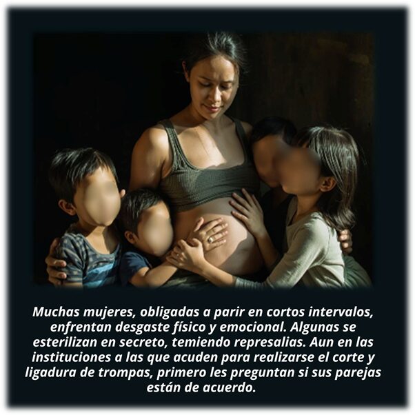 Muchas mujeres, obligadas a parir en cortos intervalos, enfrentan desgaste físico y emocional. Algunas se esterilizan en secreto, temiendo represalias. Aun en las instituciones a las que acuden para realizarse el corte y ligadura de trompas, primero les preguntan si sus parejas están de acuerdo.